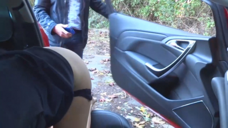 Ну улице достаточно холодно, но не на столько, чтобы молоденькая пассия взрослого папика не сняла штаны, оставшись в одних трусиках, а потом и вовсе без них. Мужчина отходил покурить, а когда вернулся, застал подружку стоящую раком в сторону двери, в точности как делают собаки. Сделав пару фотографий на память, он достал член и всего минуту трахался, обкончавшись немного внутрь, а основную порцию спермы выдрочил на землю. Закончив с сексом, спутница отправилась на заднее сиденье, решив доехать до дома в одном белье.