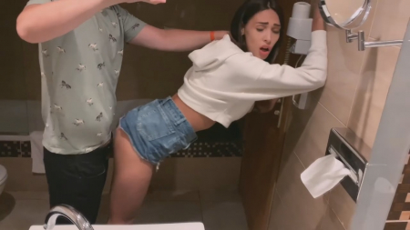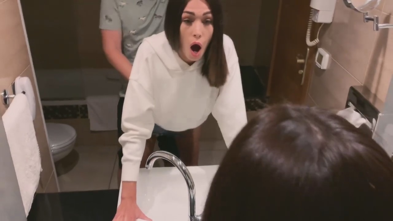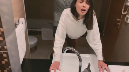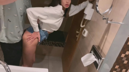 Молодец с айфоном в руках и очках вовсе не ботан. У него подружка - супер классная девочка, которой нравится демонстрировать всему миру свой секс, по большей части работая на зарубежную аудиторию, что приносит неплохие бабки, например, эту хату, в совмещенном санузле которой был записан данный ролик, купили именно на эти сбережения. В этот раз соотечественники трахаются в одежде перед туалетным зеркалом, брюнетка просто приподняла джинсовую короткую юбочку повыше и, немного нагнувшись, повернулась к молодому человеку, запулявшему и симпатичный хавальник и попав немного в ротик, отчего малышка поперхнулась, засмеявшись с данного конфуза.