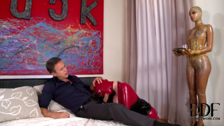 Сексуальная девушка любит ходить по дому в латексном костюме. Не снимая этого костюма, милашка развлекается со своим другом. Девушка начинает медленно сосать, постепенно увеличивая темп. А потом мужчина захотел, чтобы к их играм присоединилась служанка (девушка тоже в латексном костюме стояла все время как вкопанная с подносом в руках). Хозяйка связала латексной служанке руки, а мужчина отдолбил девку в зад.