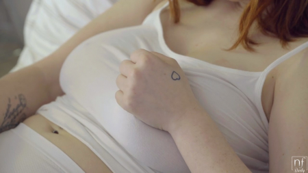 Сразу после пробуждения рыженькая симпатяга принялась ласкать киску. Ей только что снился замечательный эротический сон и пока он не забыт, девушка решила под фантазию помастурбировать. Довольно быстро она испытала оргазм, а ее любимый, лежащий рядом, так и не проснулся от странных вибраций кровати. Передохнув несколько минут и переодевшись в сексуальное белье, героиня вернулась к бойфренду, который как раз открыл глаза и увидел маленький подарочек с небритым лобком. Любовнику очень нравятся большие сиськи подруги и она об этом знает, поэтому специально старается трясти ими, сосет сосок и дала между ними потрахать перед самой кончиной темного парня.