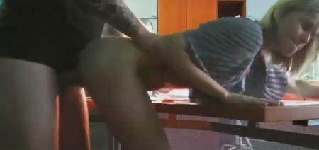 Любовники полагали, что все ушли на обед, но сильно ошиблись. Мужчина загнул коллегу возле стола, начав долбить ее сладкую вагину. Такие ножки возбудят кого хочешь, потому терпеть до конца дня не представилось возможным. Бухгалтер тоже не против отдохнуть по-особенному, потому с удовольствием согласилась на интрижку. Кончить ни у кого не получилось, так как в дверь кто-то постучал и пара быстренько начала одеваться, 100 процентов спалившись, ведь шлепки и постанывания обоих были слышны извне. Начальство также будет обеспокоено жалобой от других завистливых работников, кому не посчастливилось трахнуть желанную сотрудницу.