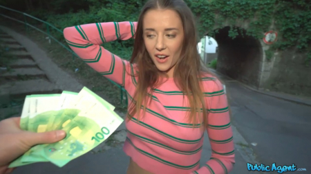 Охотник на доверчивых шкур вновь выбрался на выслеживание таковых. Буквально нескольких минут хватило чтобы найти подходящую жертву из числа красивых студенток. Одна как раз шла из колледжа домой, а на пути ей встретился этот раскидывающийся деньгами парень. За сотку евро он предложил снять куртку, еще за сто показать сиськи: такой у него эксперимент, проверять на что способны люди ради денег. Уже дошло до 500 евро за минет и, несмотря на наличие бойфренда, 25-летняя шлюшка согласилась. На этом этапе она узнала каких размеров достоинство и не стала просить доплату за проникновение длинным агрегатом.