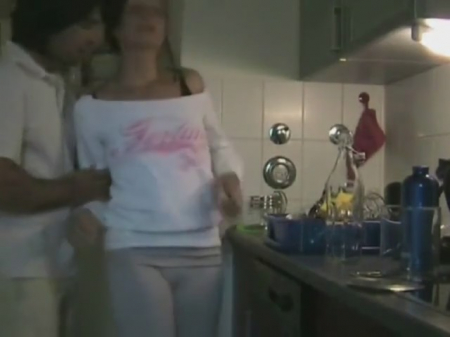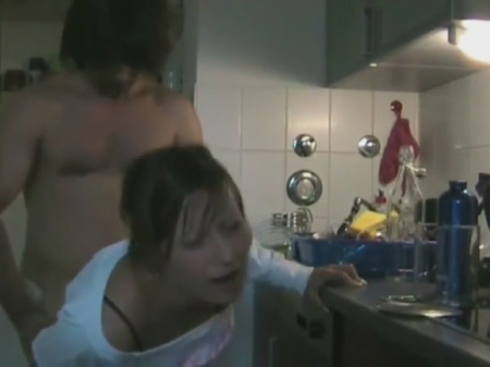 С прошлого раза камера осталась на штативе на кухне. Здесь первый раз вчера пара пробовала записать целенаправленно домашнее видео, но материал показался неудачным. Зато сегодня, когда баба действительно трудилась - вытирала посуду после мойки, волосатый чел решил к ней поприставать. Она никогда не отказывает и сейчас не стала делать исключений, присев перед его вытащенным членом лицом, чтобы полностью его проглотить, прежде чем она загнется и примет его отвердевший в себя. От возбуждения парень быстро прекратил соитие, вновь поставив подругу перед собой на корточки чтобы закончить дело ей в рот.