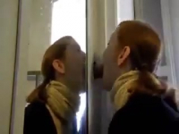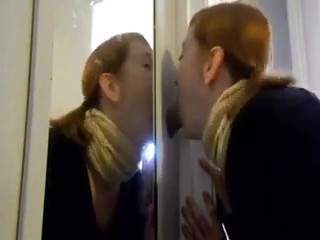 Сосет через дырку в двери