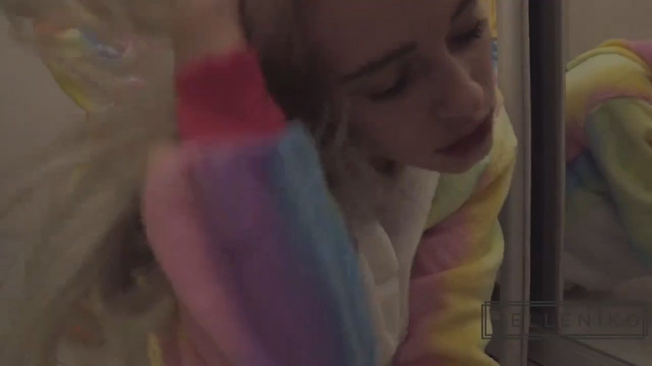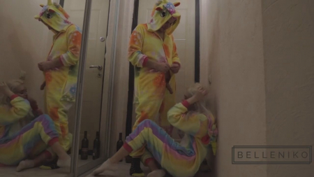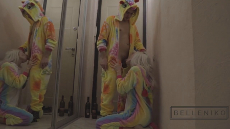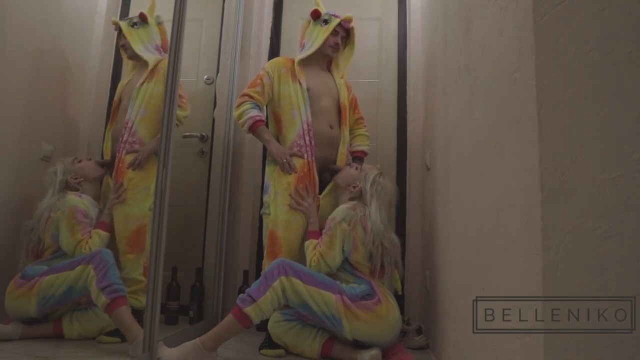 Пьяные ребята пришли к парню домой. Они встретились на улице в пижамах, выполненных под единорогов. Им бы проспаться, но они даже не знают как зовут друг друга. Разувшись и поставив бутылку возле двери, гостья хотела пройти дальше, но персонаж мужского пола ее остановил, предложив посмотреть на его фокус. Он вытащил через ширинку вялого, а блондинка тут же припала его сосать, добавив фразу "ты мне сразу понравился, я только хотела предложить". Молодые люди расположились на полу возле шкафа с зеркалом, где после доведения до состояния стояка, барышня села сверху очком. Дальше только раком и спущенка на язычок.