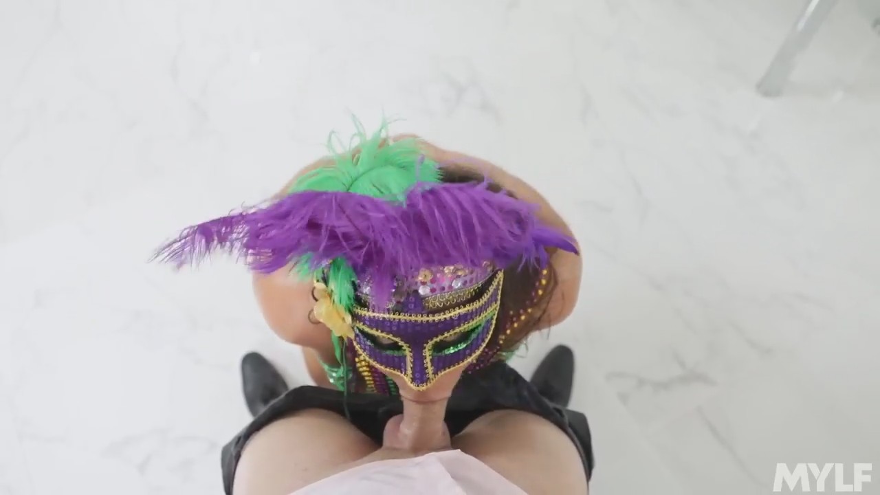 В конце вы поймете почему маска тут к месту. Сразу после грандиозного карнавала участница отправилась к мужчине домой, который подцепил толстожопую танцовщицу, поймав из всех самую крупную рыбеху. Ему было интересно попробовать секс с одетой в цветастый костюм женщиной, не зная в лицо незнакомку. После первых поцелуев чувак в белой рубашке с бусами поверх облил сочное тело латинки маслом и только после этого повел как собачку на коленках за членом в сторону своего ложа, где любовники страстно совокупились. Оргазм состоялся на маску, часть спермы попала на глаз и тут актриса раскрывает личность - свое страшненькое лицо. Было однозначно лучше.