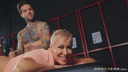 Жена успела заебать мужа, показывая какие татуировки можно еще сделать на своем теле, все равно мастер опаздывает и нужно чем-то заняться. Вот он появился, а старый супруг уснул в приемной комнате, пока короткостриженная блондинка пошла уродоваться. Решено было разукрасить спину, но для этого нужно приспускать штанишки. Парень будто не заметил как сунул палец любвеобильной даме в зад, услышав одобрительный стон. Пока он трудился над женщиной, проснулся муж, решивший проверить что за подергивания за ширмой и почему так страдает любимая. Увидев полную картину, мужик психанул и оставил любовников наедине, подумав, что так татуировщик снимает боль при помощи члена в жопе.
