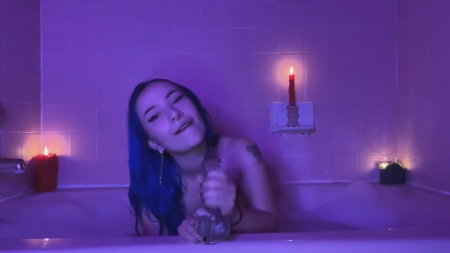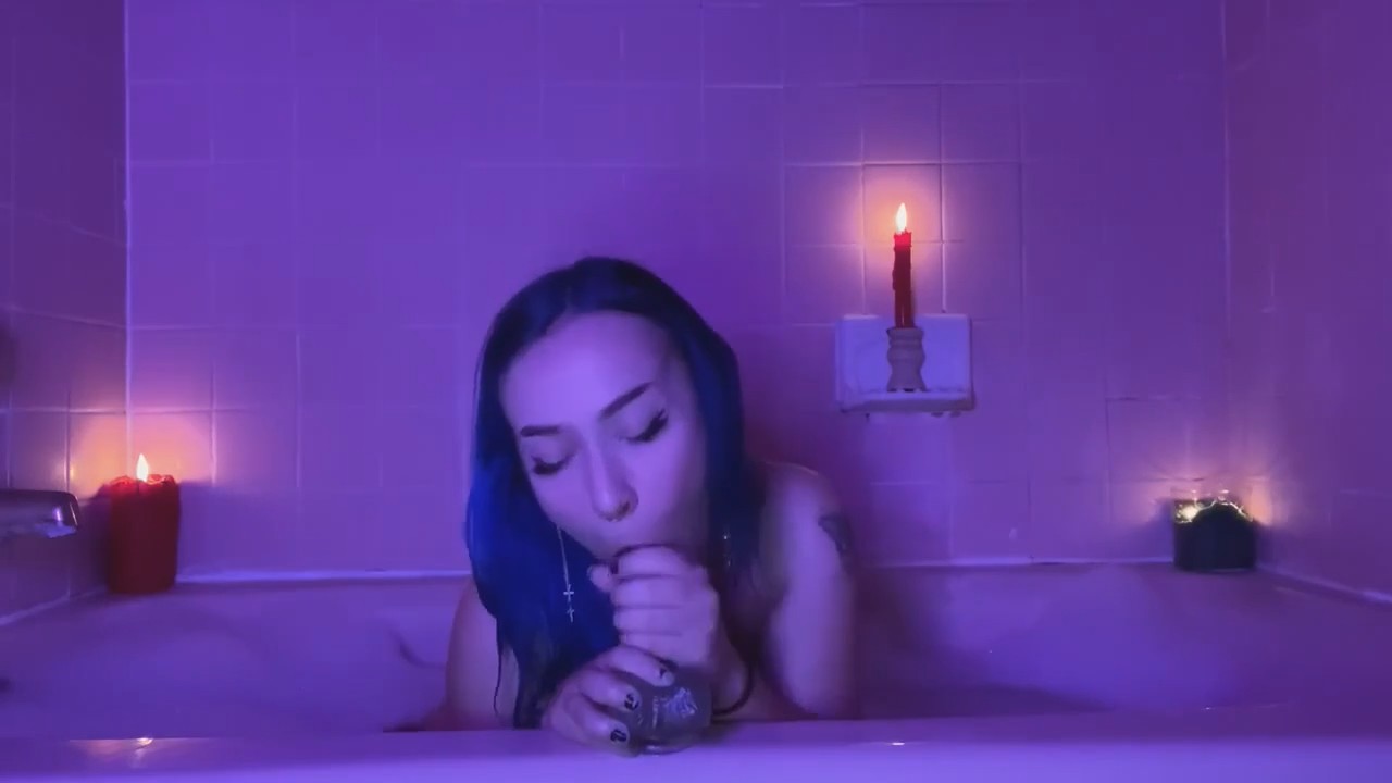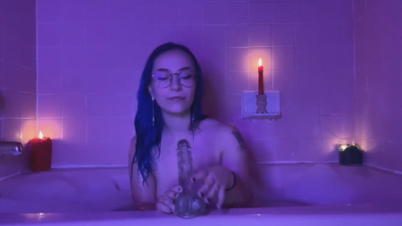Набрав полную ванную с пеной и осветив комнату свечами, синеволосая тня залезла помыться не снимая очков. Намылив большую грудь, она приступила к остальным частям тела, после чего достала первый самотык, который отсосала избавившись от очков на носу. Винишко-тян приклеила его сперва к стене, потом к самой ванне, а следом достала более толстый вариант, наполненный искусственной спермой, которая выльется в финале когда деваха будет дрочить резиновую игрушку сиськами. До этого она успела поприседать на самотык, повернувшись крупной задницей поближе к камере.