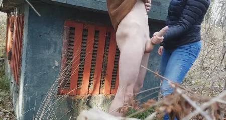 Худенький молодой человек зашел глубоко в лес, надеясь, что ему никто не помешает подрочить на камеру, установленную неподалеку. Для начала он был полностью голый, но холод заставил надеть свитер и продолжить дрочку длинного писюна рукой. Неожиданно сбоку появилась незнакомка в черной куртке и джинсах. Не слышно о чем они поговорили, но девушка подошла вплотную и стала сама гонять шкурку парня. Встав с другой стороны, чтобы было удобно работать правой рукой, она довела поступательно-возвратными движениями шалуна до мощного оргазма. Сучка как появилась, так и спокойно ушла, оставив собираться домой довольного эксгибициониста.