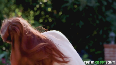 Прекрасная погода, шикарный дом с собственным бассейном на большом заднем дворе, почему бы не помочить писечку и не позагорать?! Со вторым планом не очень получилось, так как вскоре к рыжей любовнице присоединился бойфренд, запустивший пальцы внутрь светлой дырочки. Шаловливая девочка не стала останавливать его эротический массаж, ведь теперь внутри его игривый язычок, делающий очень приятно. Какой же секс без проникновения?! Настала очередь пососать самой и оседлать его пенис верхом под открытым небом, смазав его для лучшего скольжения.