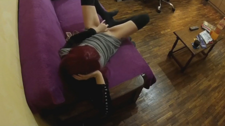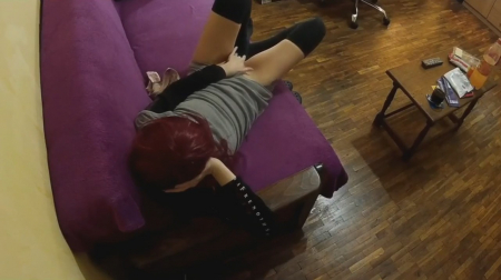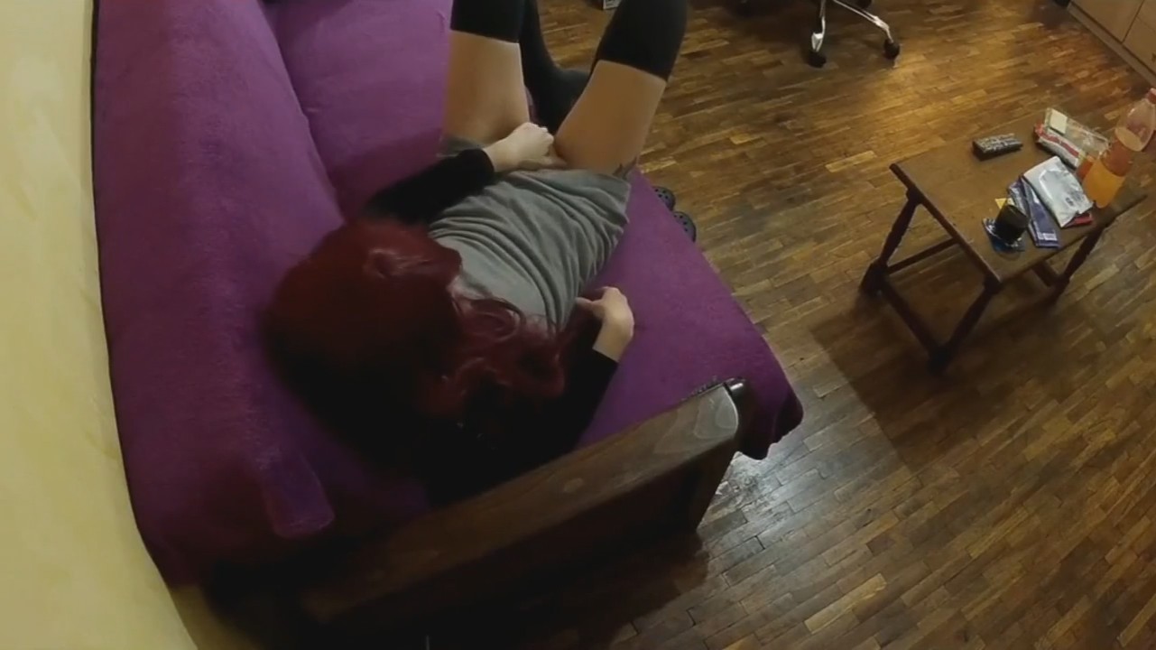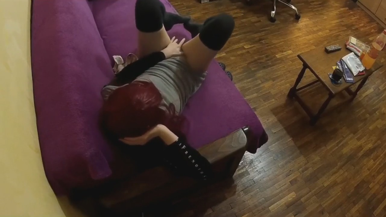 После работы красноволосая девка легла в платье на диван попялиться в телевизор. Переключая по списку каналы наткнулась на эротический. Левша спускает с себя трусики и начинает беззвучно мастурбировать ручкой. При этом попавшаяся онанистка совсем забыла про домашнее видеонаблюдение, которое транслируется прямиком в телефон супруга, наблюдающего как его сожительница развлекается когда остается дома одна. Не, ну а чего такого-то, в самом деле?! Особое внимание привлекает пульт в пленке - это старческий прикол.