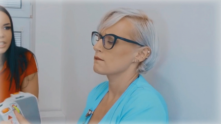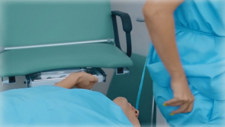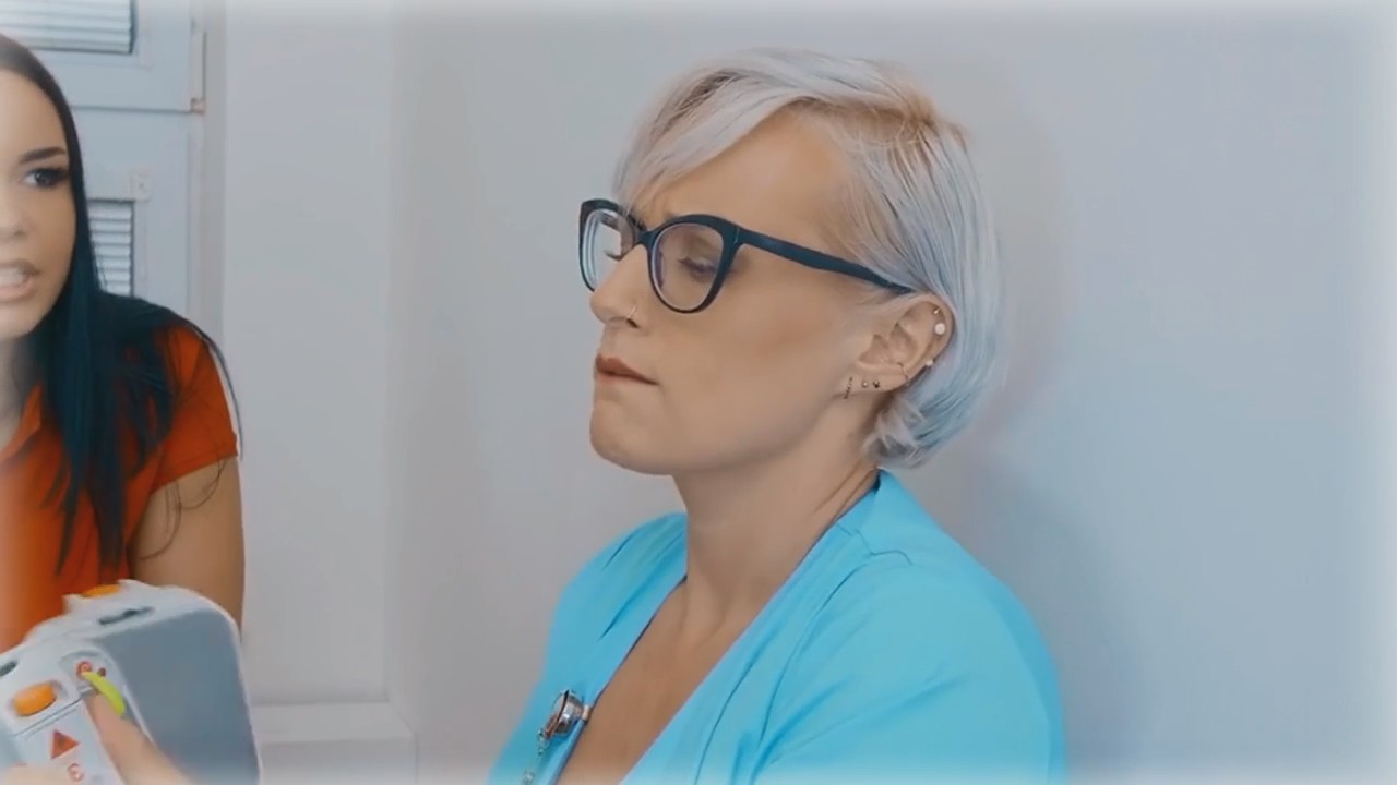 Бестолковый пацан пришел на стажировку в настоящую больницу. В первый же день ему пришлось познакомиться с одной очень сексапильной сотрудницей, но пока что он об этом не знает, так как она переодевается за стеной и ему хочется поскорее на нее посмотреть. Взяв дрель, он проделал отверстие в перегородке, туда парнишка высунул добротный хуй, который заметила короткостриженная женщина в очках, принявшаяся его лобызать с милой улыбочкой. Но работу нужно как-то делать, другой врач с помощницей привез симулятор человека на каталке для тренировки. Собственно, это никак не помешало насаживаться попой стоя спиной, а когда коллеги немного разошлись, то и заняться нормальным сексом. Экспрессивная женщина наконец-то увидела щуплого хозяина пениса, оттрахав его так, что доктора сбежались подглядывать через щелку как там здорово развлекаются.