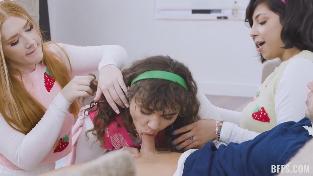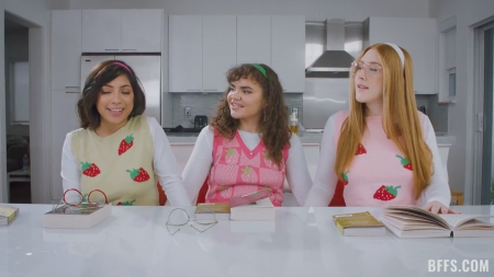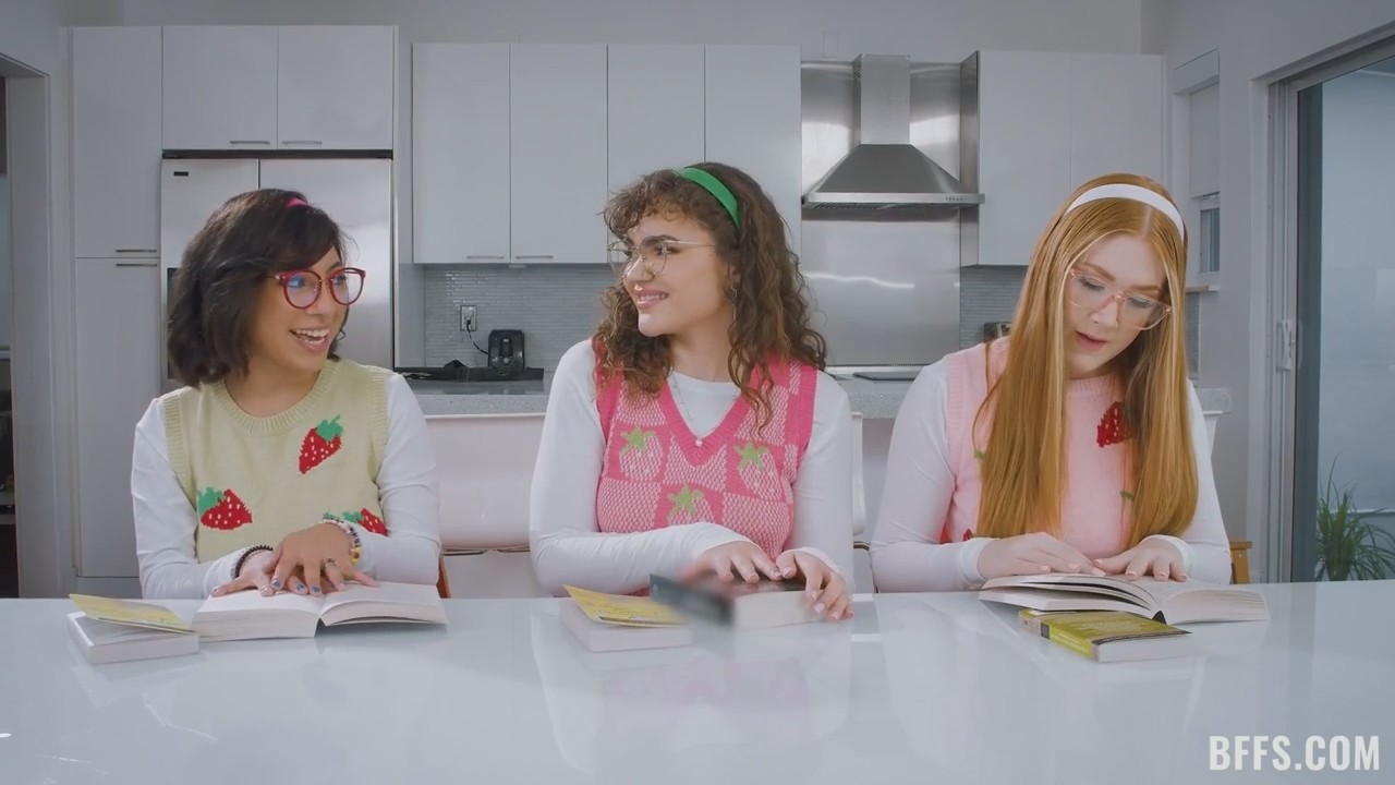 Три девушки собрались у товарища по хобби дома, чтобы устроить групповое чтение и разбор произведения Шекспира. Но у него недавно созрел план как трахнуть всех трех подружек, чтобы они сами захотели отдаться. Вместо Шекспира он достал другие книги эротического толка. Ботанки хоть и отнеслись скептически, но решили все же попробовать, не зря же их маленькое сообщество называется "любители книг". Довольно быстро очкастые телочки возбудились и стали гладить друг дружку по ногам под столом, а потом принялись за парня. Каждая ему отсосала, дала трахнуть в писечку и подставила лицо под выплески семени.