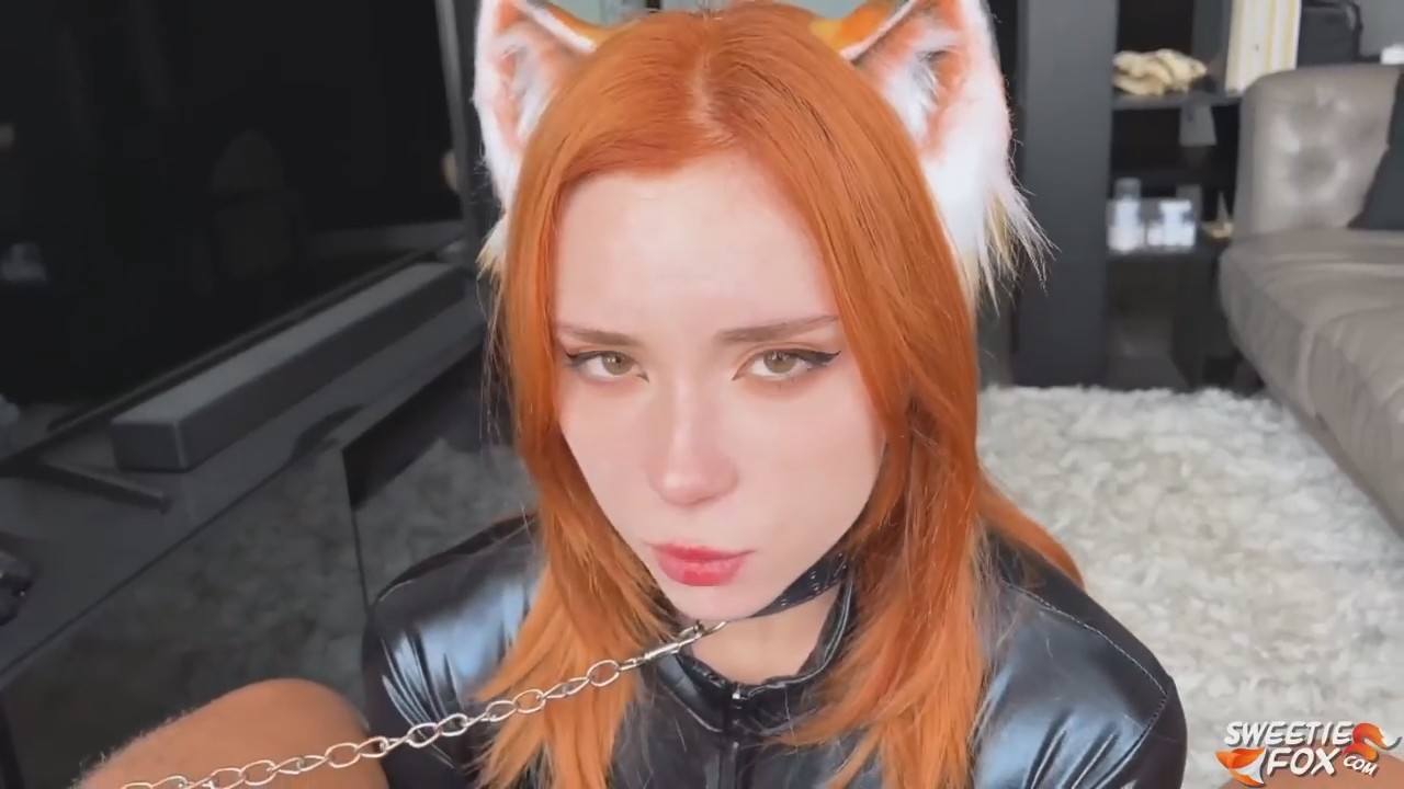 Миловидная рыжая россиянка в черном костюме из тонкой кожи принесла на коленях поводок и отдала из зубов хозяину. Так она показывает свою преданность и желание сосать пока тот не кончит. Красивая малышка с ушками на голове крупным планом полностью поглощает пенис, глядя ему в глаза, помогая ему достичь экстаза с помощью обеих рук. Когда тот уже начал кончать без предупреждения, она не смогла сразу усмирить свой пыл и даже сделала больно, но рука хозяина показала, что нужно дрочить помедленнее, а после красотка взяла в рот уже полностью покрытую спермой пососаку.