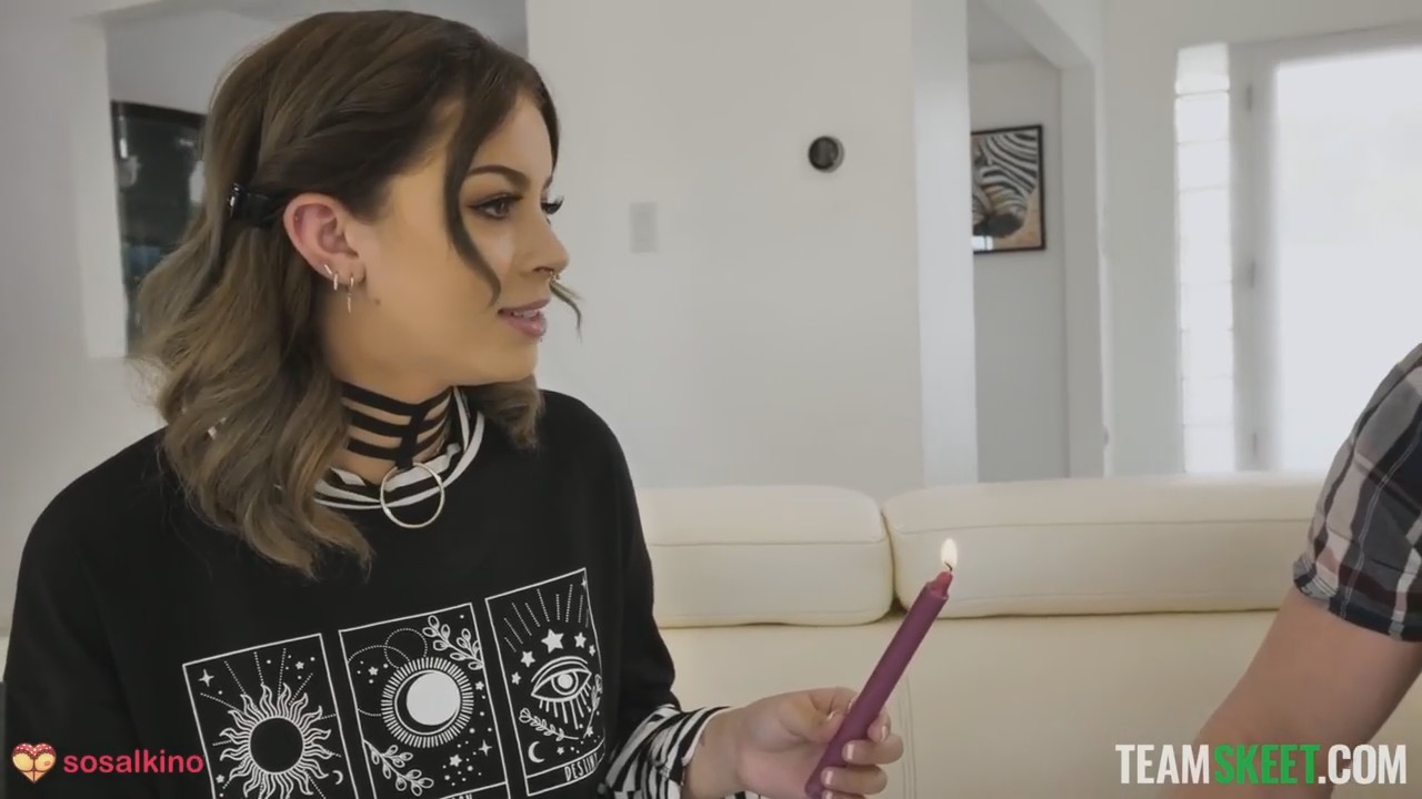 Ребята вместе пошли к парню домой - это приличное место, а родителей не будет еще несколько часов. У них у обоих нет друзей, потому пообщаться перед проектом - отличная идея. Как выяснилось, неформалка любит бродить по кладбищам, ходить на концерты и тому подобное, а еще в рюкзаке имеется вибратор и свечки, сейчас девка покажет на однокласснике как это все применяется. Ему показалось это даже забавным, хоть торта и нет, парафин на тело очень возбудил обоих. Красотка помастурбировала вибратором через трусики, ошеломила великолепными сиськами с пирсингом и принялась заниматься животным сексом с окончанием в киску. Довольно необычно и не верится, что у такой симпатяги совсем нет друзей!