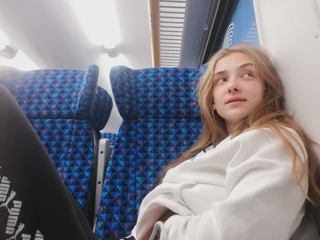 Молоденькая любительница получать легкое удовольствие заприметила, что вагон совсем пустой. Ее это сразу навело на мысль о мастурбации, к которой она приступила, просунув руку под штаны. Ее выражение лица говорит о том как ей хорошо, но приходится смотреть по сторонам, чтобы никто из пассажиров электрички ничего не заподозрил. Второй рукой она трогала грудь - так намного приятней - весь кайф волнами разносится по телу нимфоманки.
