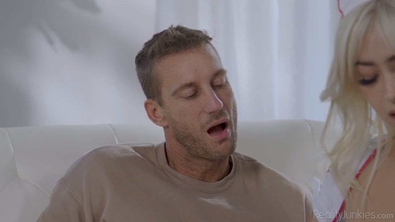 Мужчина никого не ждал, а в дверь все равно постучала незнакомка в костюме медсестрички. Она была уверена, что пришла по правильному адресу, ее стали убеждать на счет ошибки, но когда хозяин услышал о содержимом услуги, то притворился тем человеком, для которого это все было на самом деле, изрядно захромав. Грудастая блондиночка сделала первую часть работы, а потом показала грудь, так как нечасто к ней в руки попадают на массаж такие приятные мужики. Отдрочив сиськами и трахнув своей пиздой, она отправилась и дальше разминать стариков, жалующихся на боль.