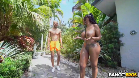 Встречает зрителя необычайно большая негритянская задница на весь экран, чья владелица ходит на тренажере, делая ее еще больше и подкаченней. Да, это трудная работа - носить такую сраку, поэтому негритянка пошла облиться водой от жары возле дома, раздевшись догола. Но испортил идиллию уединения какой-то худощавый тип, увидевший издалека не плод своего воображения, а самую настоящую грудасто-попастую леди, о которой он только мог мечтать. Так как незнакомца почти сразу заметили, ему пришлось признаться, будто он просто ищет свою собаку, а тут еще и большой хуй напрягся так, что стал маячить перед возбужденной хозяйкой. Только такой может пробраться поглубже во влагалище через здоровенные булки, гостю стали рады.