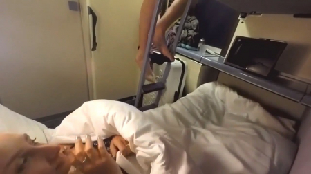 Развратница поставила камеру рядом и стала тихонько мастурбировать, но еле слышные вздохи побудили мужчину сверху спуститься попить воды и разведать обстановку. Незнакомец сразу понял, что милая леди мастурбирует и не стал сопротивляться, когда она потянула руку к его трусам. Девушка наяривала пилотку и одновременно дрочила парню, после чего решилась трахнуться с ним без презерватива, попробовав на вкус член с яйцами. Чуть позже извращенка легла обратно под одеяло и дождалась спермы на грудь, после чего еще несколько минут очень быстро мастурбировала одна, чтобы и самой испытать оргазм в тихом поезде.