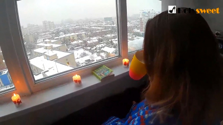 Пухлая девушка заранее постелила на пол какую-то дубленку, расставила зажженные свечи по подоконнику и села рядом, начав читать книжку. Романтическую обстановку под спокойную музыку разбавил ее партнер, очень похожий на пидорка (это не голословные заявления, можете убедиться сами). Долго размусоливать голый чувак не стал и сразу поставил подружку рачком перед пространством между окном и кроватью, приступив ее трахать сзади. Чуть позже он поднял ее на ноги, она все также была загнута и присела лишь для того, чтобы ей надрочили на сиськи пару капель.