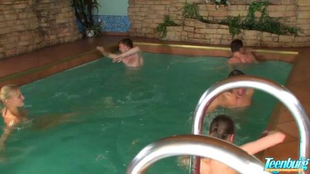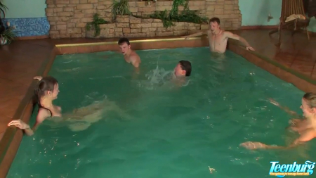 Юная оргия двух девчонок и трех пацанов возле бассейнаHD