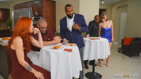 Раскрепощенная межрасовая парочка собралась с другими незнакомцами в доме на маленькой вечеринке. Ребята не стесняются других, но когда их попросили вести себя более сдержанно, телочка потащила своего самца в ванную комнату, где сделала минет и получила порцию семени в лицо, из-за чего разозлилась и прогнала приятеля прочь. Теперь она положила глаз на парня, пришедшего со своей девушкой. Он подошел к героине и вручил записку, где было всего одно емкое слово "спальня". Там он оприходовал извращенку во все щели как та и хотела с самого начала, а не сосать черную елду.