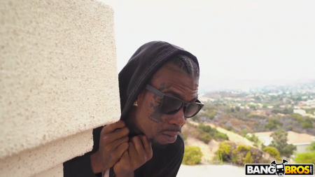 Кучерявая, очень светлая кожей, негритянка попшикала на себя маслом и топлес легла загорать с прекрасными видами на город с холма, где расположен особняк. В это время по участку прогуливался парень из бедного района, который решил оценить как живут богачи. Полуголая девка быстро обнаружила взгляд на себе и стала гоняться за незнакомцем, пока тот не выдохся, хотя играет в баскетбольной команде. "Покажи его мне!" - скомандовала хозяйка, показывая пальцем на его шорты. Перед лицом мулатки под силой притяжения повис эрегированный здоровенный хуй, который она принялась сосать и воткнула в свою смуглую дырочку под открытым небом, отпустив с миром незваного гостя.