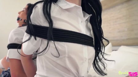 Когда девушке становится скучно, она начинает думать свои мысли. К чему это привело сестер? Одна из них предложила второй приколоться над сводным братиком, связав друг другу руки и закричав. Они соврали прибежавшему на крики парню, будто какой-то незнакомец проник в дом и связал их руки веревками, а во рты вставил кляп, но не нужно прямо сейчас развязывать, ведь у сестричек была сексуальная фантазия на эту тему и самое время ее воплотить в реальность. Так как девчонки не хотели заниматься инцестом друг с другом, они не отлизывали киски, а только соски и теребили пальцами друг дружке клиторы, обменявшись в финале слюной вперемешку со спермой.