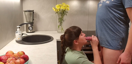 Пышнотелая бабца что-то делала на кухне, когда к ней сзади подошел бойфренд с камерой. Мужчина подманил к себе пальцем толстушку и она сразу поняла, что сейчас придется ему сосать. В ее милой улыбочке читается как она любит это дело и сама, без лишних слов присев на корточки, расстегивает его штаны, чтобы начать уже доставлять ему удовольствие жадным, натренированным ртом. Но на этом их кухонные приключения не закончились, ведь партнер все же немного поебал главную героиню на столешнице и совсем чуть-чуть рачком, после чего со спокойной душой спустил ей первенца за щеку.