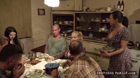 Большая компания взрослых людей собралась отметить за общим столом скорое рождение ребенка одной из присутствующих. Неожиданно у нее отошли воды и самая грудастая гостья не смогла сдержать рвотные позывы, срочно побежав проблеваться в унитаз. Следом за ней отправился мужчина, сидевший напротив. В туалете он пристроился сзади к блондинке и засадил в ее пилотку, зажав рот рукой. Та не была особо против резкого соития и получила массу удовольствия, а за всем происходящим пронаблюдала хозяйка, решившая разузнать куда подевались сразу двое. Когда они вышли, смогли поздравить семью с рождением ребенка.
