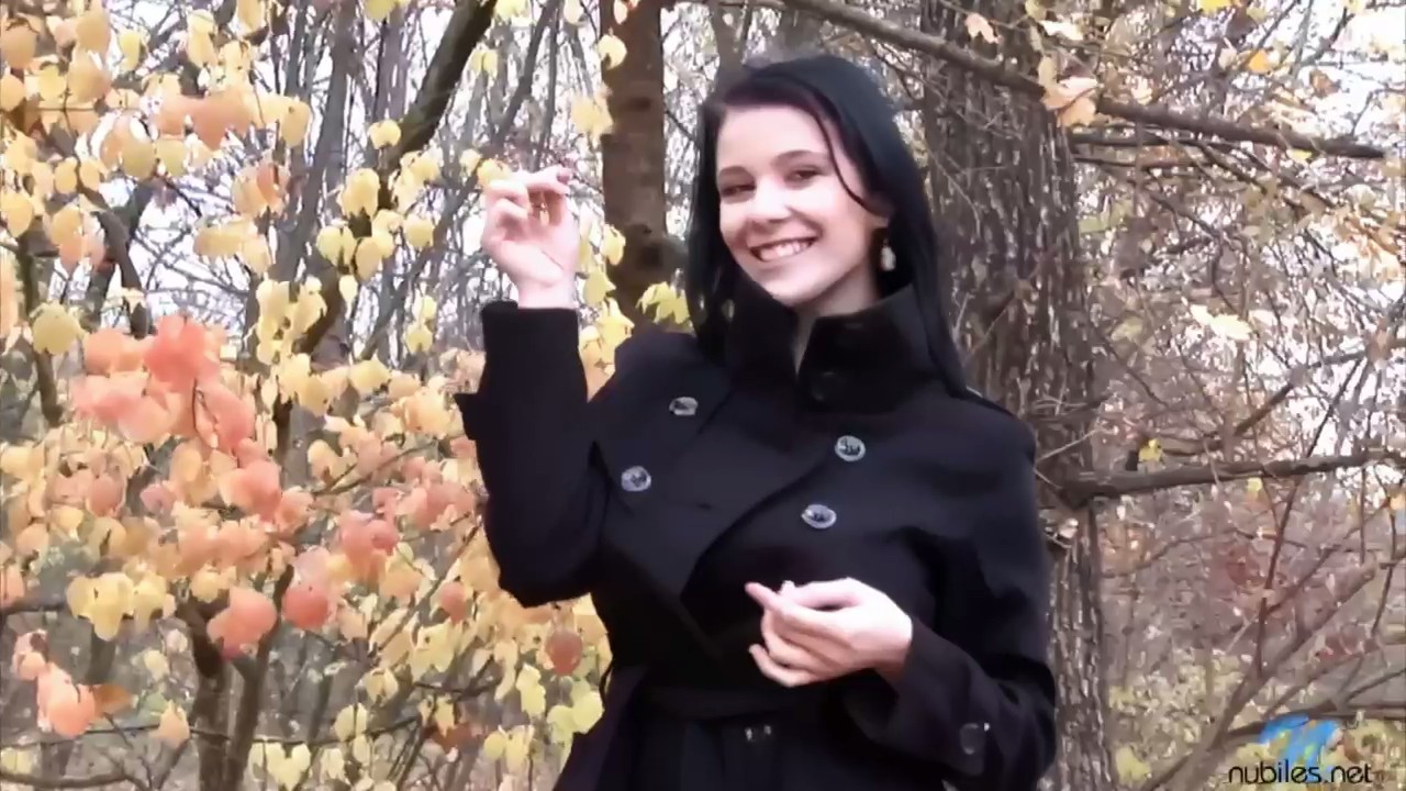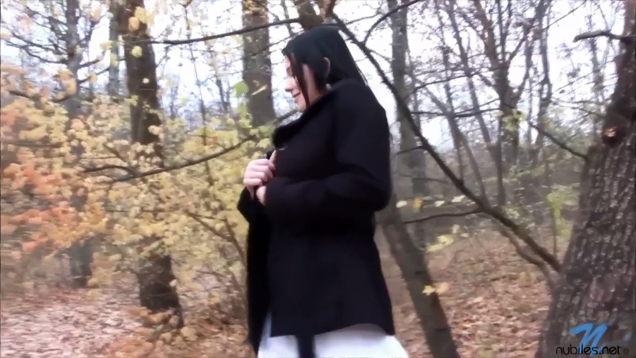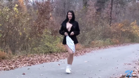 Красивая девушка в сопровождении оператора, выступающего заодно и в виде охранника, пошла прогуляться по ближайшему лесочку, ничего не надев под осеннее пальтишко. Несмотря на то, что погода достаточно холодная, симпатяга-эксгибиционистка распахивает свой наряд, освежая стройное тело свежим воздухом. Найдя подходящее место возле дерева, брюнетка мастурбирует немного, ласкает наливную грудь руками и просто весело проводит время одна, наслаждаясь компанией пальчиков и бритой киски, так и не кончившей при всем желании это сделать.