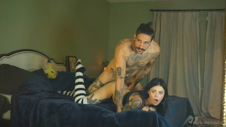 Красивая молодая девушка (Plurrrkittyy - Lilmoonbbyy) захотела временно попробовать участь рабыни, руки которой зафиксированы за спиной, а клитор ласкает очень мощный вибратор, который слышно даже на маленькой громкости видео. Девушка сквозь стоны глубоко берет в ротик перед зеркалом, истекая собственной слюной. Усатый выдумщик ставит подружку на колени и ебет сзади на кровати, но ей больше нравится лечь животиком на постель и наслаждаться проникающим пенисом бойфренда, все время любующимся со стороны на прекрасный вид татуированной девки, чья голова повернута в ту же сторону за тем же самым.