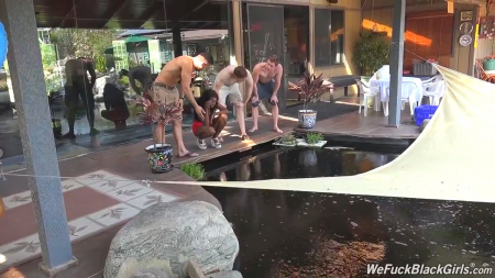 Хозяин отдыхал в своем доме вместе с друзьями, которым показалось, что его питомцы в виде рыб под открытым небом ведут себя слишком вяло. Тогда тот позвонил специалистке, вскоре приехавшей посмотреть на живых существ, познакомившись с каждым парнем. Вроде бы ничего криминального не было замечено ветеринаром, поэтому хозяин отвел негритянку на задний двор, где предложил посмотреть еще на три хищных пираньи, что прячутся у них в штанах. На удивление, та не стала отказывать себе в удовольствии, но не разрешила трахать задницу, зато позволила накончать двум в рот, а третьему на сиськи.