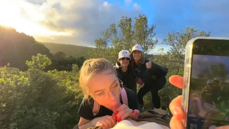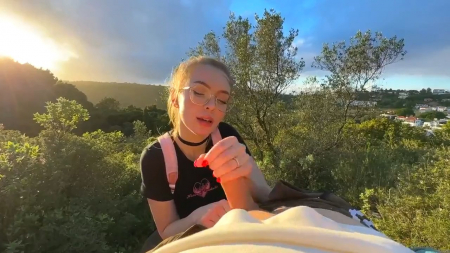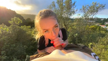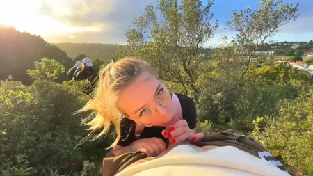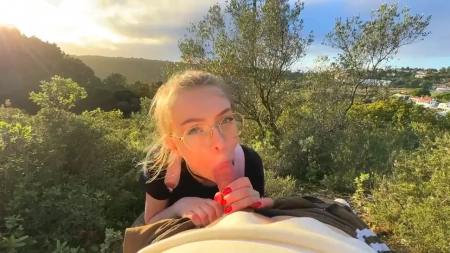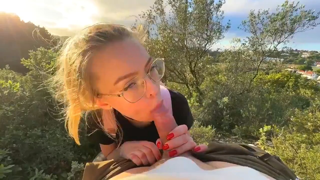 Красивая русская девчонка посреди зеленого холма делала минет своему молодому человеку. Глаза наслаждались ее личиком, его член наслаждался ротиком, все было прекрасно. Но тут за спиной подруги появились два силуэта, не особо смутившихся от увиденного и еще менее засмущалась сама делающая минет милашка, не переставшая сосать и не обернувшаяся на незнакомцев, спросивших можно ли подняться по холму еще выше, а второй просьбой стала фотография на мобильник. Им даже интересно стало, получилось ли запечатлеть сосущую и их на фоне одновременно. После этого незнакомцы ушли, а девочке кончили в рот, чтобы та выплюнула семя на землю.