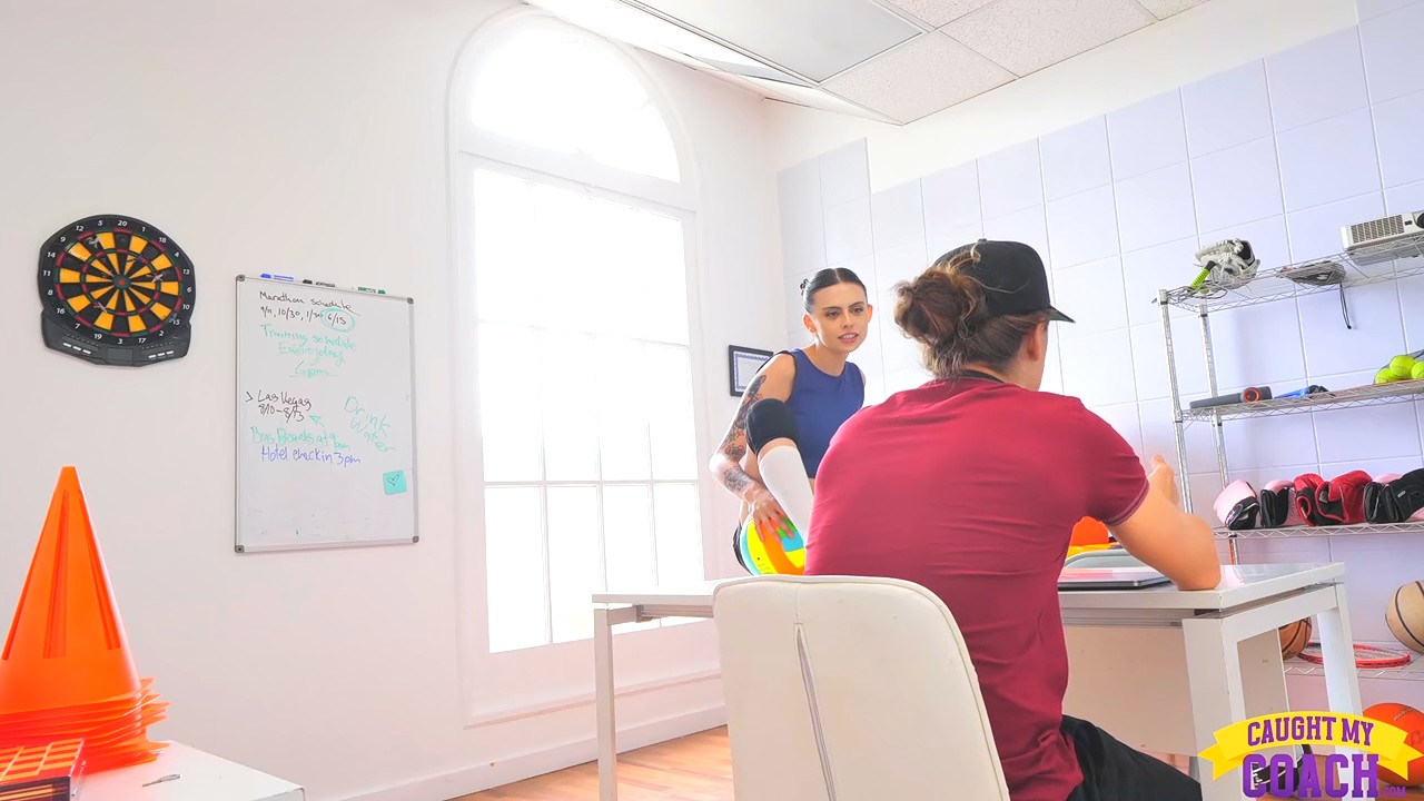Будущая звезда волейбола разговаривает с кем-то по телефону и сидит в кабинете тренера у того на столе. Не успела с него сползти привлекательная худенькая девчонка с черными как уголь волосами, мужчина вернулся и несколько раз попросил слезть, но девица отказалась. Вместо этого юная потаскушка стала рассказывать какие-то странные истории про бойфрендов, про большие члены, что вообще было не интересно слушать тренеру, оказавшемуся в заложниках собственной похоти - шлюшка неожиданно сняла с него штаны и получила что хотела, а именно сочный хуй, оказавшийся у нее во всех, кроме анальной, дырочках. Ну вот и зачем ей такой громадный, если в нее столько не лезет?!