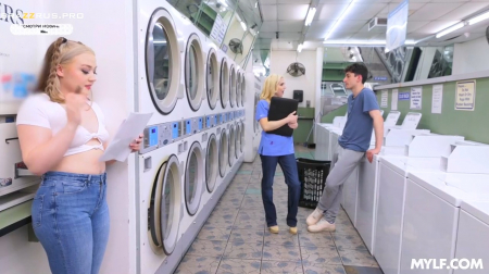 Дочка и мать полностью погрузились в работу, записывая какие детали нужно поменять в сушилках и огромных стиральных машинах. Вдруг, в платное заведение зашел один из лучших клиентов. Почему-то именно в День Матери он больше всего понравился владелице прачечной. Падчерица осталась в стороне подслушивать разговор, пока мама пытается соблазнить молодого человека на веселое времяпровождение. Уже очень скоро его пальцы ласкали между ног 37-летней блондинки, ее приемный отпрыск все еще поглядывала и тихонько мастурбировала, а потом и вовсе присоединилась к начавшейся групповухе посреди прачечной. И это при том, что у них есть муж и отец.
