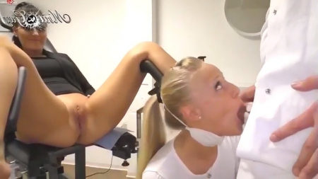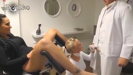 Темноволосая немка пришла на прием к гинекологу, где ее встретила белобрысая помощница доктора, поучаствовавшая в дальнейшем процессе. Она уже понимала, что лысый хрен не пропустит такую сочную самочку, поэтому встала рядом и даже первая начала ласкать пациентку пальчиком, проникая в ее пирсингованное влагалище в перчатках. Мужчина же дождался когда ассистентка ему отсосет, чтобы вставить в гостью клиники свой вставший хуй, дабы той даже позы в кресле не пришлось менять. Задумывалось кончить внутрь для поддержания женского здоровья - на том и разошлись.