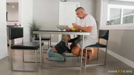 Красивая татуированная дева с очень большой силиконовой грудью не знала чем себя занять. Вдруг ей на глаза попался завтракающий супруг, но ему не было интересно ничего, кроме новостей спорта. Прямым текстом жена сказала, что хочет воспользоваться его большим хером в своих интересах, но тот снова никак не отреагировал. Тогда белокурая татуированная симпатяга залезла к нему под стол и начала сосать, но он доел и ушел поваляться. Тогда любимая включила погромче порнушку на телевизоре и не прошло и полгода, как он наконец-то дал использовать свой большой половой орган.
