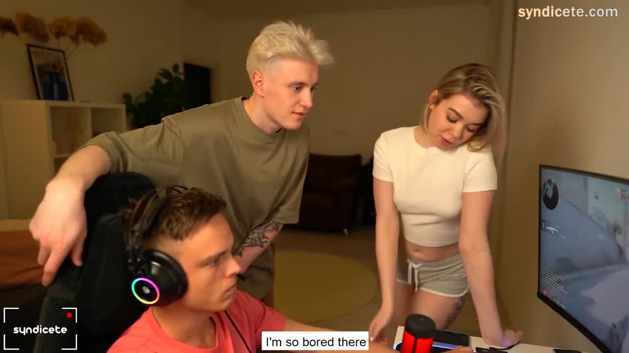 Студентики по очереди играют в комп. Больше всего им нравится часами задротить КС, поэтому даже девушка уже устала смотреть на одни и те же локации. Она поинтересовалась как ей сейчас развлечься и стала тереться о член свободного паренька. Так как игроман был в наушниках, он не слышал, что друзья стали шпилиться буквально у него за спиной. Причем, даже когда он увидел обконченное лицо подруги и торчащий стручок товарища, он просто высказался матом и ушел в туалет справить нужду, а телка с мясистой задницей могла бы осчастливить и его, но каэсер был слишком занят игрой.