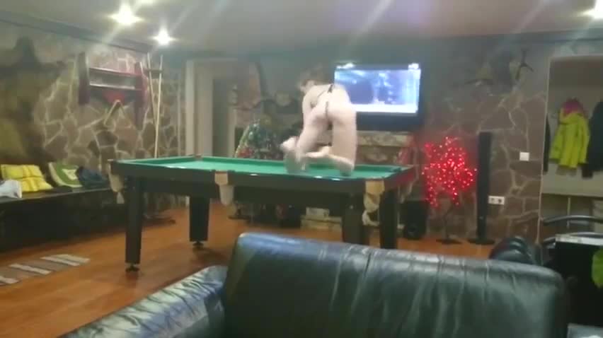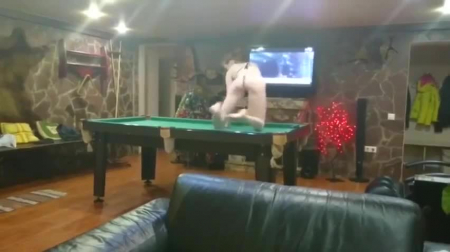 Видео начинается с того, что девушка берет в рот практически под столом, находясь на уровне пениса, где ей не очень удобно, зато приятно тому, кому делают отсос. После этого пританцовывающая под русскую попсу барышня начала манить привлекательной подтянутой фигурой кого-нибудь из мальчиков, чтобы ей впендюрили сзади и один такой вызвался сразу, заставивший открыть рот от кайфа жену. После секса на бильярдном столе, наконец-то, и второй персонаж пристроился, но уже спереди - ему сексвайф отсосала, пока женщину ебали рачком - в ее любимой позиции вообще.