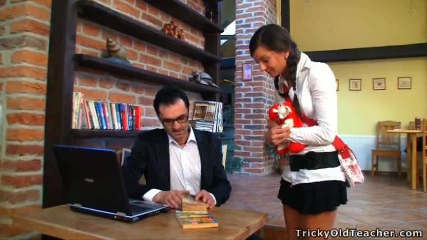 Юная стеснительная симпатяга побеспокоила своего преподавателя, заглянув к зубриле домой. Она хотела бы взять у него дополнительный урок как у репетитора, но у зрелого мужчины не нашелся дополнительный стул, потому брюнеточка села к нему на колени. Довольно скоро он положил ладонь на теплую область в промежности, куда заглянула красавица, позволившая отодвинуть трусики и прикоснуться к ее прекрасному лону. Вскоре девчонка сделала минет репетитору, а потом перепихнулась с ним на столе, подставив сиськи под сперму образованного мужчины в очках.