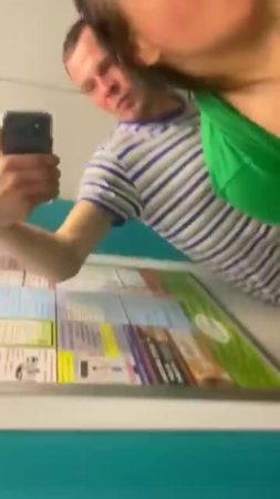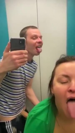 Парень со своей подругой заняли лифт в дневное время, когда все должны быть на работе для того, чтобы там как-то разнообразить совместную половую жизнь. Еще не дождавшись открытия дверей лифта, гопник уже достал свой член, а ведь внутри кто-то мог быть, но яйца уже бурлят и, когда парочка извращенцев заходит внутрь кабины, любовница тут же присаживается на корточки и начинает сосать его член, пока лифт не вызвала соседка с бутылками для воды, с которой все трое поехали до первого этажа, чтобы вновь нажать на верхний и потрахаться рачком лицом в зеркалу без зеленой футболки, а в конце надрочить пышную влажную пизду рукой.