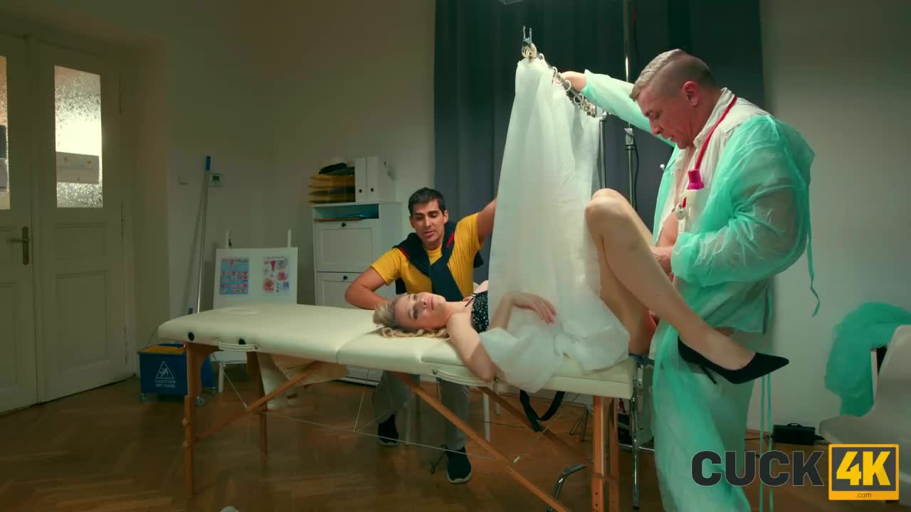Парочка целый час сидит в коридоре в ожидании доктора. Появился мужчина с ведром на колесиках и шваброй. Ему прилетела претензия будто он доктор и его так долго ожидают и тот быстро вжился в роль врача, пригласив пройти на осмотр. Осматривать ему нужно симпатичную незнакомку. Когда за ширмой самозванец стал лизать киску и тыкать в нее пальцами, белокурая изменщица попросила мужа сгонять за водичкой, а пока она оторвется с незнакомцем, запудрившим им обоим мозги. Вернувший рогоносец даже нормально воспринял то, что сперма врача поможет запустить все жизненно важные процессы жены. Вот только вскоре пришел настоящий врач, рассказавший про чудака со шваброй. [Cuck4k] Nela Decker - Wait, you’re actually a doctor.