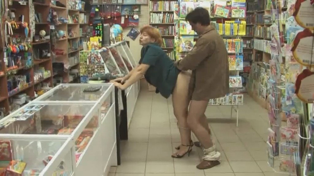 Во время разговора с продавщицей мужчина, находящийся в состоянии алкогольного опьянения, падает. А когда пытается подняться, то натыкается лицом на попку тетки. Вот тут то короткостриженная сучка, давно не знавшая радости от секса, мгновенно расслабляется и уже, мысленно готовая на все, получает огромное наслаждение от куни. После, уже в очень возбужденном состоянии, делает алкашу минет и отдается прямо посредине торгового зала.