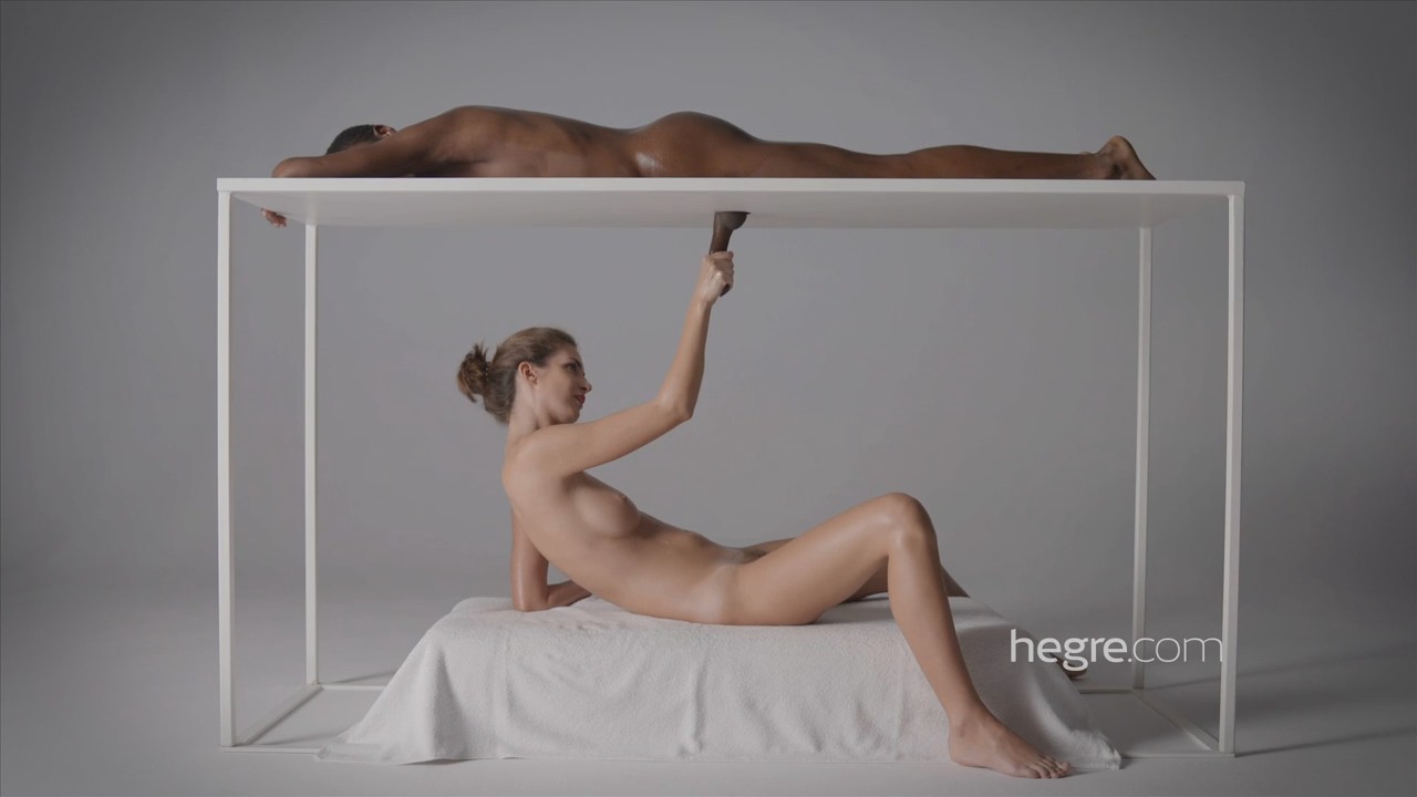 Обнаженная симпатяга делает эротический массаж чернокожему парню. Мужчина, лежащий на столе лицом вниз в расслабленном состоянии, получает огромное наслаждение от нежных чувственных ласк умелых рук. Такими же неторопливыми движениями очаровательная мастерица и член ласкает (свисающий в специальную дырку), даже доит фаллос, постепенно подводя клиента к оргазму.