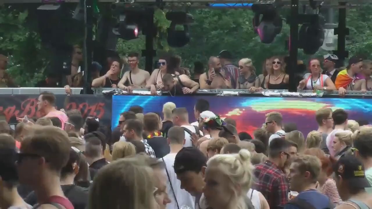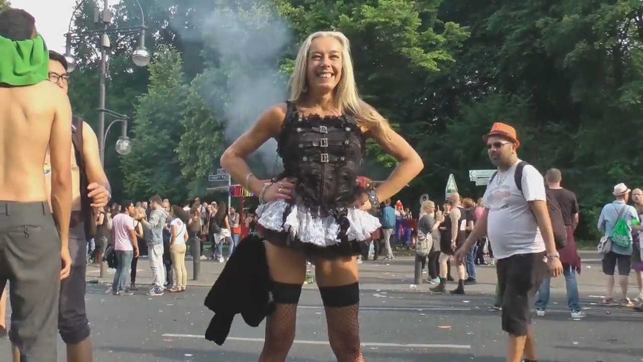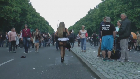 Фест в Мюнхене - вот он настоящий рай для эксгибиционистов. Длинноволосая женщина в чулках и коротеньком сексуальном наряде танцует под громкую музыку и постепенно начинает показывать писечку. К очаровательной больной тетке присоединяется мужчина в довольно запоминающемся костюме. Он показывает член и надрачивает его, получая двойное удовольствие от посторонних взглядов. Насладившись чужими взорами по отдельности, парочка сексом занялась так же прилюдно.