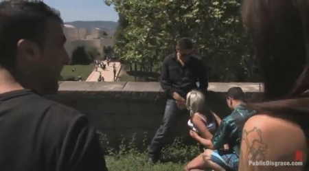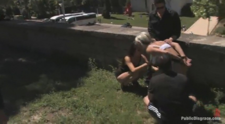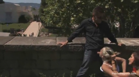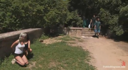Привлекательная блондинка со связанными за спиной руками получает в вагину резиновую игрушку и стонет от наслаждения. Удовольствие симпатяга получает в парке и эмоции испытывает более сильные, нежели при классическом трахе. Незнакомый мужчина не смог пройти мимо столь завораживающего зрелища и подошел к лесбушкам. Без тени сомнения мужик расстегнул ширинку и засунул фаллос в ротик блондиночке, которая в свою очередь совсем не против была подарить удовольствие кому-то. Постепенно возле девушек остановились еще два мужчины, которые наблюдали за тем, как блонда делает минет. Когда же первый был удовлетворен, очаровашке развязали руки и она принялась сразу за двоих.