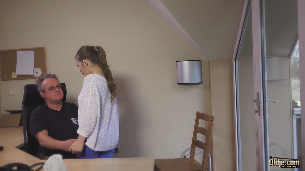 Просматривая в кабинете контент порно сайтов, на одном из ресурсов симпатичная богачка нашла компрометирующее видео на одного из своих подчиненных. Позвав взрослого мужчину, девушка в гневе начала спрашивать "что это такое". Мужчина поначалу отнекивался, будто на этом видео совсем не он, но надпись на футболке стала последним решающим фактором в "опознании личности". Следующий поступок развратной малышки поверг мужчину в легкий ступор - ведь девушка захотела, чтобы зрелый мужик оттрахал ее также, как и шлюшку в порно ролике. Впрочем, ступор быстренько прошел и дедулька оторвался по полной программе с молодой шалуньей.