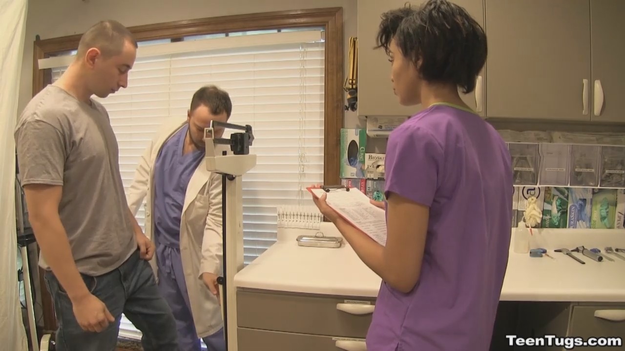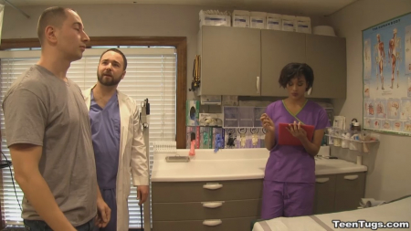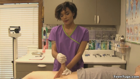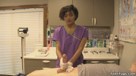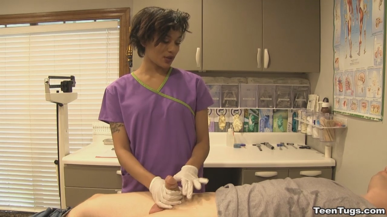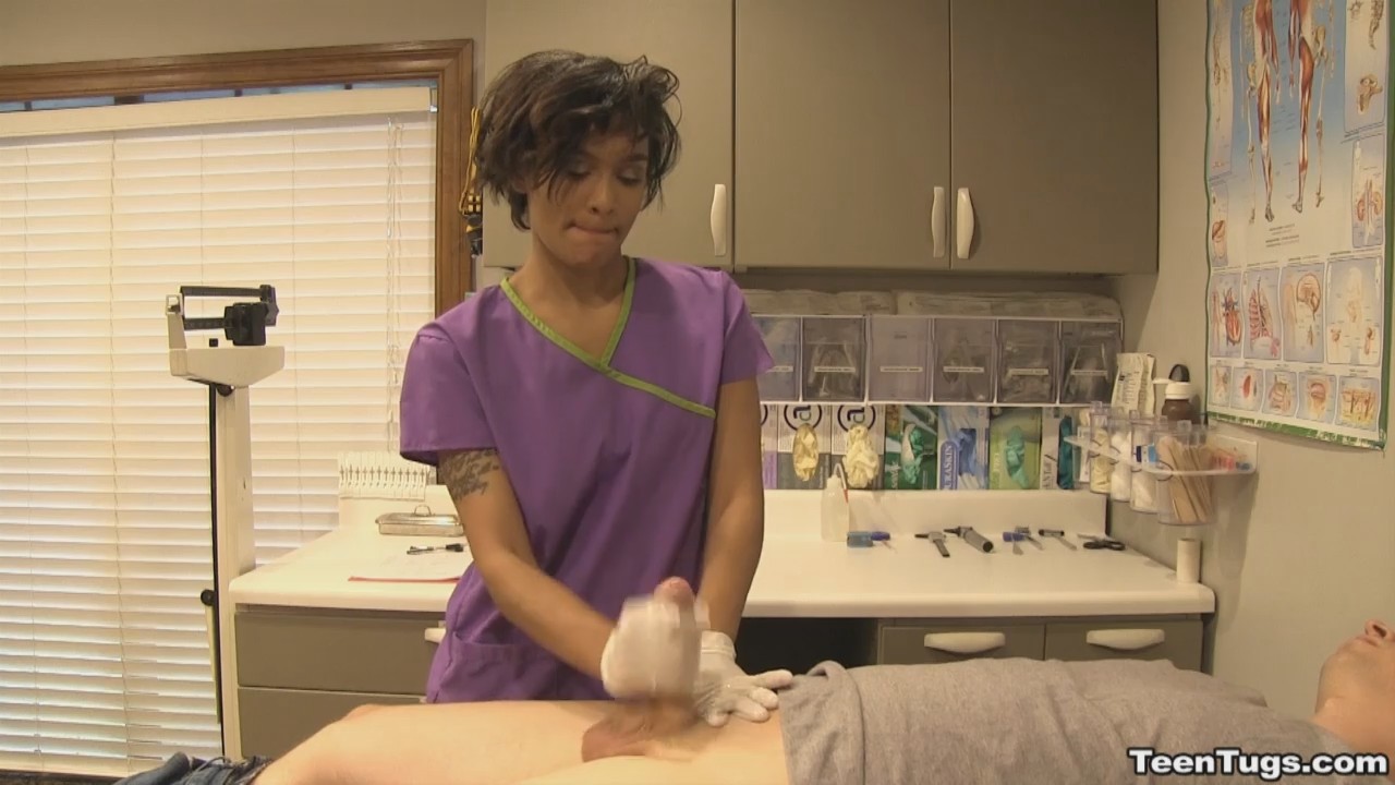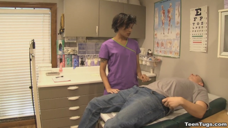 Мужчина пришел в клинику, желая стать донором спермы и срубить побольше бабла. Но прежде его должен осмотреть доктор. Не успев приступить к осмотру, врач вышел из кабинета по делам, а развратная медсестричка все свое внимание обратила на клиента. Развратная малышка схватилась за писюн, и мужчина не смог противиться предстоящему удовольствию - просто лежал и кайф ловил, пока короткостриженная медсестричка ему дрочила.