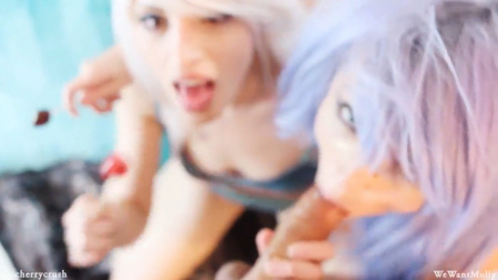 Девушки с просто диким макияжем и цветом волос решили полакомиться сладким. И девушки не ограничились просто леденцами, они попробовали на вкус и член общего друга. Подружки не просто сосут чупа-чупсы, они обмазывают твердый член сладостями и облизывают его, а потом сосут. В общем, девушки забавляются, а парень кайфует и снимает их на камеру.